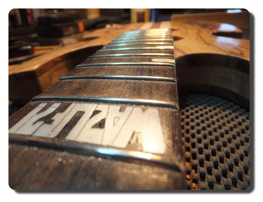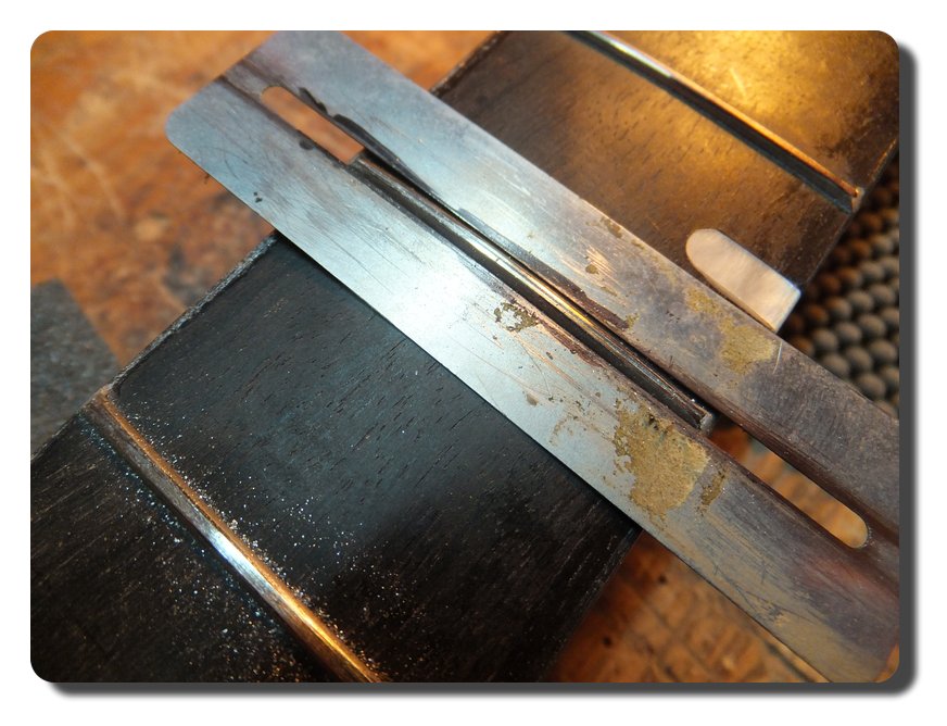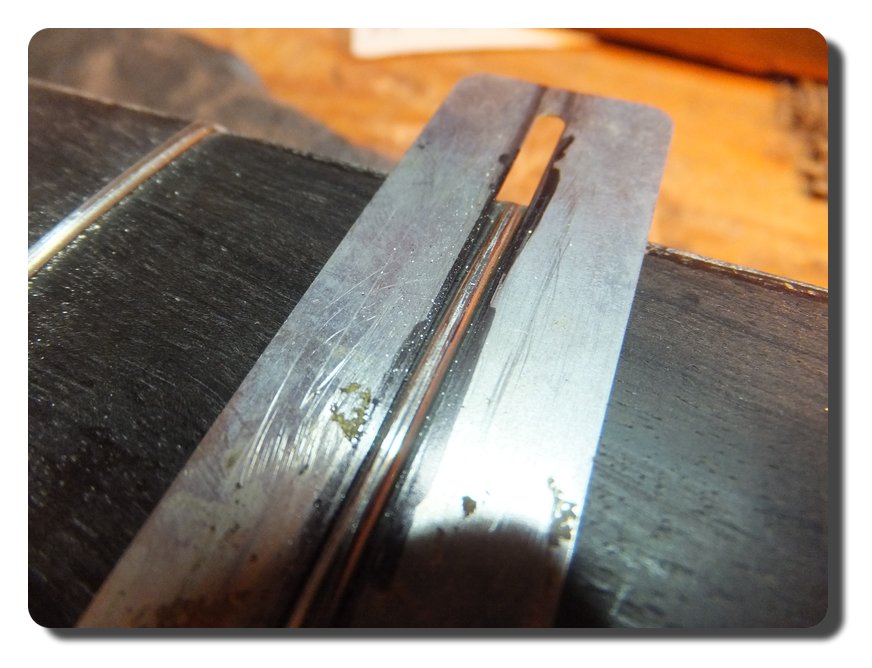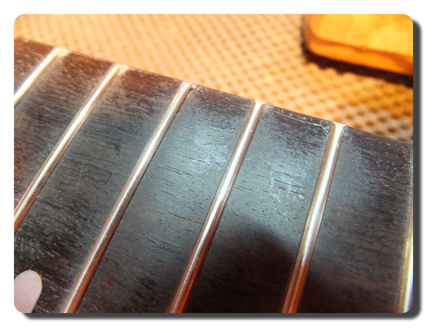 sur cette photo, on voit le travail a moitié effectué. les cotés brillent mais il reste une trace mat sur le dessus de la frette qu’il faut donc faire disparaître.